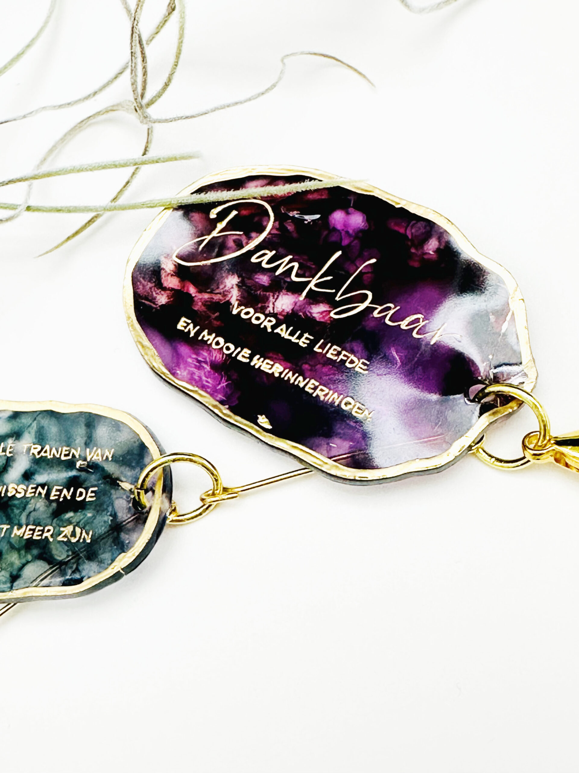 Deze techniek kun je ook gebruiken om een heel persoonlijk cadeau te maken, zoals deze hieronder die ik maakte voor een vriendin. De tekst is van de rouwkaart van haar moeder die net overleden was. Dit sieraad hangt nu in de gedenkhoek.